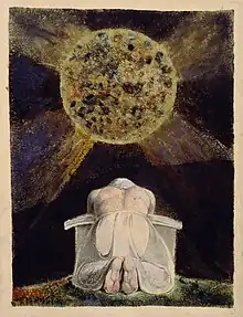 The archetype of the Creator is a familiar image in his work. Here, Blake depicts his demiurgic figure Urizen stooped in prayer, contemplating the world he has forged. The Song of Los is the third in a series of illuminated books painted by Blake and his wife, collectively known as the Continental Prophecies.