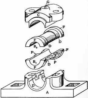 to one another about their common axis. The part of the shaft in the bearing is commonly called the journal. The component parts of a small bearing, pillow block, plummer block or pedestal, as it is variously styled, are illustrated in fig. 1, and these parts, put together, are further illustrated in fig. 2 with the shaft added. Corresponding parts are similarly lettered in the two illustrations. The shaft (S) is encircled by the brasses (B1 and B2) made of gun metal, phosphor bronze or other suitable material. The lower brass fits into the main casting (A) in the semicircular seat provided for it, and is prevented from moving endways by the flanges (F, F) and from turning with the shaft by the projections (P, P), which fit into corresponding recesses in the casting (A), one of which is shown at p. After the shaft has been placed in position, the upper brass (B2) and the cap (C) are put on and both are held in place by the bolts (Q1, Q2). The brasses are bedded into the main casting (A) and the cap (C) respectively at the surfaces D, D, D, D. The complete bearing is held to the framework of the machine by bolts (R1, R2) passing through holes (H, H) which are slotted to allow endwise adjustment of the whole bearing in order to facilitate the alignment of the shaft. Oil or other lubricant is introduced through the hole (G), and it passes through the top brass to grooves or oilways cut into the surface of the brass for the purpose of distributing the oil uniformly to the journal.