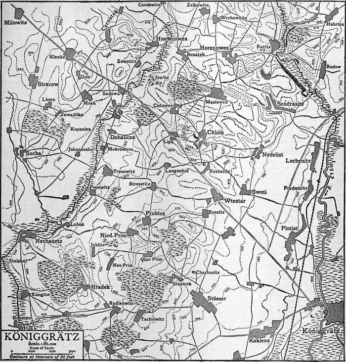 Advance of the Elbe and I. Armies—This was one of the gravest crises in Moltke's career. To overcome it he at length obtained authority (June 15th) to order the army of the Elbe into Saxony, and on the 18th the Prussians entered Dresden, the Saxons retiring along the Elbe into Bohemia; and on the same day the news that the Austrian main body was marching from Olmütz towards Prague arrived at headquarters. Moltke took three days to solve the new problem, then, on the 22nd, he ordered the I. and II. armies to cross the Austrian frontier and unite near Gitschin, a point conveniently situated about the convergence of the roads crossing the Bohemian mountains. As during this operation the II. army would be the most exposed, the to which the army of the Elbe had now been attached, was to push on its advance to the utmost. Apparently with this purpose in view, Prince Frederick Charles was instructed to break up his army corps into their constituent divisions, and move each division as a separate column on its own road, the reserve of cavalry and artillery following in rear of the centre. The consequences were the reverse of those anticipated. On the afternoon of the 26th the advance guards of the I. army and army of the Elbe came in contact with the Austrians at Hühnerwasser and Podol and drove the latter back after a sharp engagement, but, having no cavalry, could neither observe their subsequent proceedings nor estimate their strength. The prince, seeing the opportunity for a battle, immediately issued orders for an enveloping attack on Münchengrätz by his whole army, but, owing to distances and the number of units now requiring direction, it was late in the following day before all were in readiness for action. The Austrians then slipped away, and the whole of the next day was spent in getting the divisions back to their proper lines of advance. Clam-Gallas then retired deliberately to Gitschin and took up a new position. The Prussians followed on the 29th, but, owing to the lie of the roads, they had to march in two long columns, separated by almost a day's march, and when the advanced guard of the left column, late in the afternoon, gained touch with the enemy, the latter were in a position to crush them by weight of numbers, had they not suddenly been ordered to continue the retreat on Miletin.
