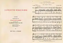 - I love, and the world is mine. Words by Florence Earle Coates; music by Clayton Johns. "To Miss Lena Little." Medium in F. Song [with piano acc.]; score (4p.) 35 cm. New York, G. Schirmer. (1891)