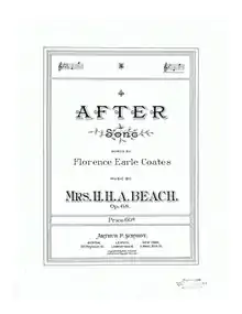 - After. Op. 68. Words by Florence Earle Coates; music by Mrs. H. H. A. Beach (Amy Beach). High and low voice. Words also printed as text. Caption title. 1 score (7 p.) ; 35 cm. Boston: Arthur P. Schmidt. (1909) (external scan)