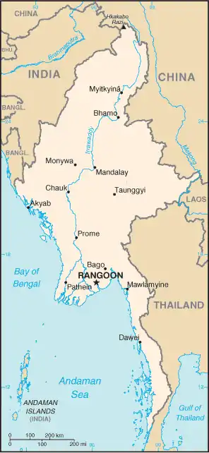 | Ports and harbors: | Bhamo, Chauk, Mandalay, Moulmein, Myitkyina, Pathein, Rangoon, Sittwe, Tavoy |