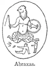 Abraxas, a-braks′as, n. a mystic word, or an amulet, consisting of a gem engraved therewith on some part of it, often bearing a mystical figure of combined human and animal form, used as a charm. [Said to be coined by the Egyptian Gnostic Basilides in 2d century to express 365 in Greek letters; thus αβραξας used as numerals = 1 + 2 + 100 + 1 + 60 + 1 + 200. But Mr C. W. King finds its origin in Heb. ha-b'rākāh, 'the blessing,' or 'sacred name,' used as the title of a Gnostic deity representing the 365 emanations of the Divine Plērōma or fullness.]