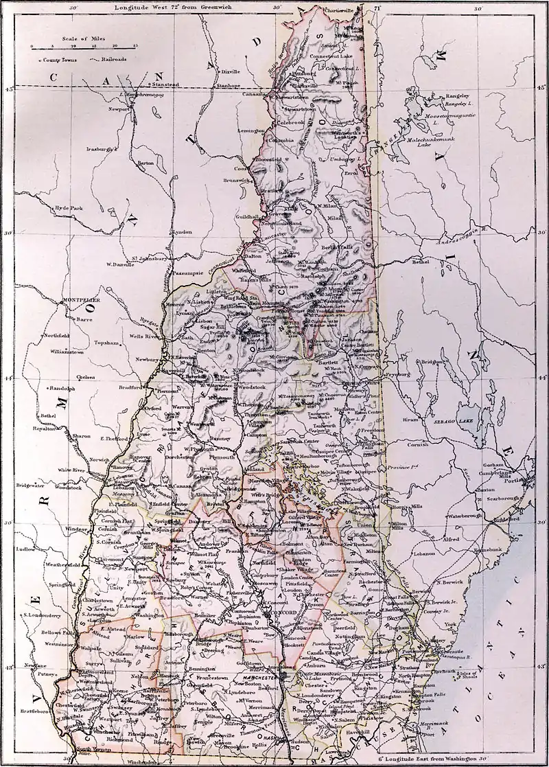 Plate VII. NEW HAMPSHIRE, one of the New England States of the American Union, lies between 70° 37' and 72° 37' W. long., and between 42° 40' and 45° 18' 23" N. lat., and has an area of 9336 square miles. Its boundaries are partly natural. On the W. it is separated from the State of Vermont by Connecticut river; on the N. from the province of Quebec by the natural ridge of the watershed between the St Lawrence and the streams flowing south to the Atlantic; on the E. from Maine by a straight line from Quebec to the source of Salmon river, thence by this river to the ocean, and south-easterly through the middle of the Isles of Shoals; the boundary on the S.E. is the Atlantic; and that on the S. is a line 2½ miles distant from and parallel to the lower Merrimack, until that river changes its course to due north and south, when the line runs magnetic west to Connecticut river. The general shape of the State is nearly that of a right-angled triangle, having the perpendicular 180 and the hypothenuse 190 miles long. The greatest width is 100 miles, from Chesterfield to the outermost of the Isles of Shoals.