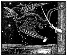 On the night of the wedding John the True took his place with drawn sword before the bridal chamber, and watched and watched and watched. Towards midnight he heard a rustling in the bridal chamber and, rushing in, saw a winged dragon coming through the window towards the King and Princess. He dashed towards it and wounded it with his sword, so that it flew out of the window, dropping blood on the way.