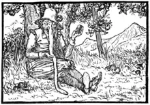 Meantime his comrades were journeying on, till on a sudden one of them stumbled against something. "What can that be?" said the other. They looked, and could think of nothing that it was like but a nose. "We will follow it and find its owner, however," said they. So they traced it up, till at last they found their poor comrade, lying stretched along under the apple-tree.
