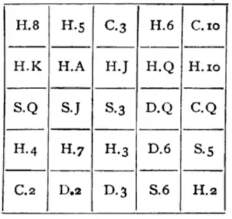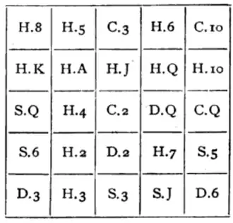 Each card, after the first, must be laid down, as it is dealt, next to one already on the table, either vertically, horizontally, or diagonally. That is to say, it must be placed immediately above, or below; to the right, or to the left; or corner to corner. The resultant oblong is considered as comprising ten Poker hands (of five cards each), five hands being reckoned horizontally (which we will call the rows) and five vertically (which we will call the columns). The object is to lay out the cards so that the aggregate total score of the ten Poker hands shall be as large as possible. The score-table is as follows (for definition of terms, see page 124):—