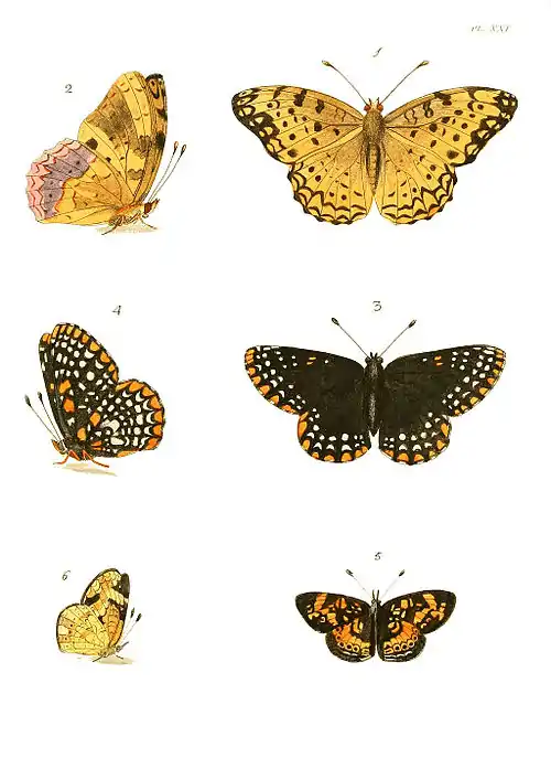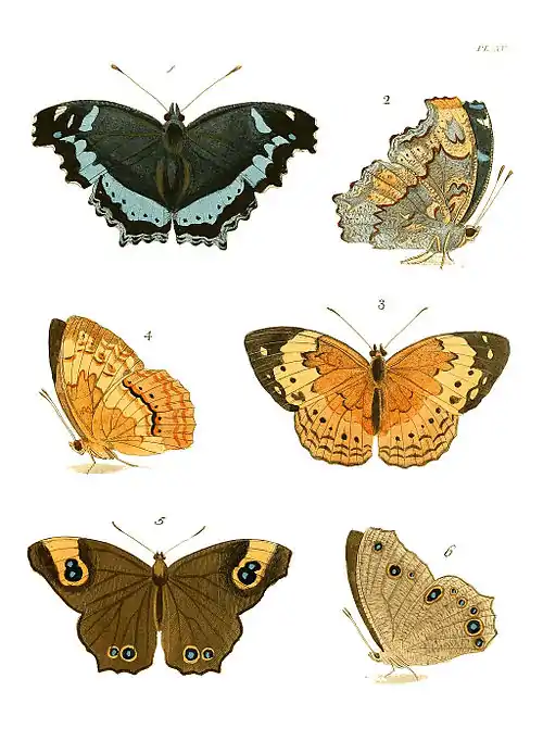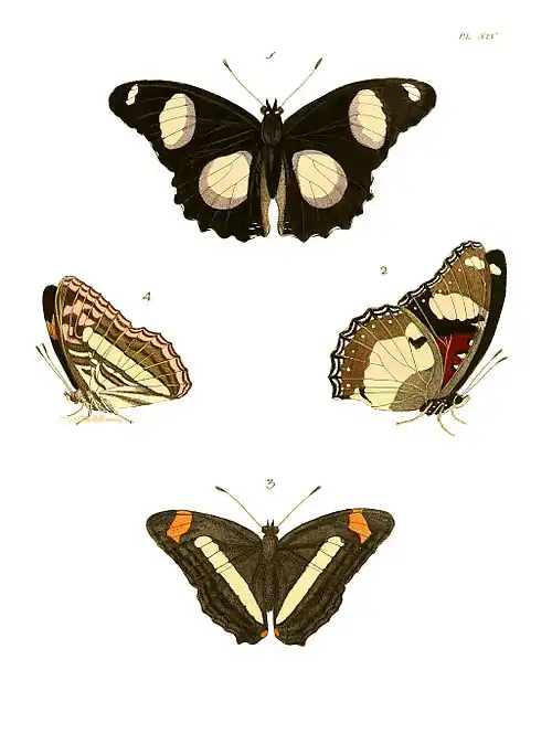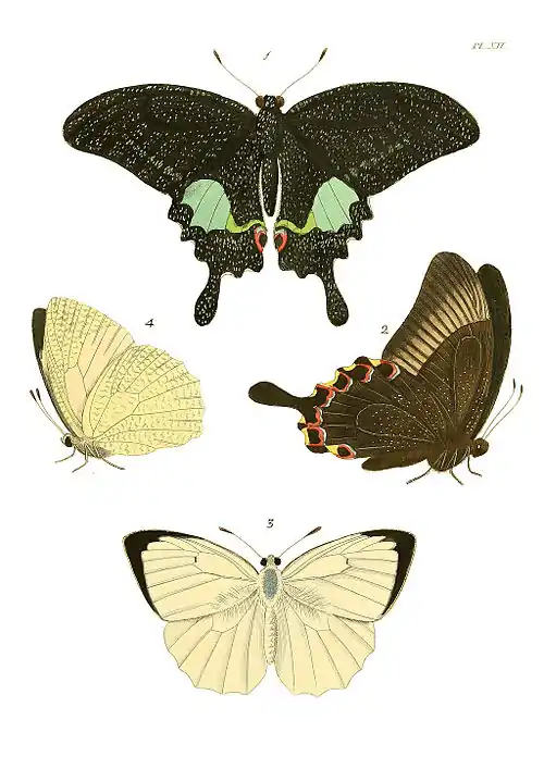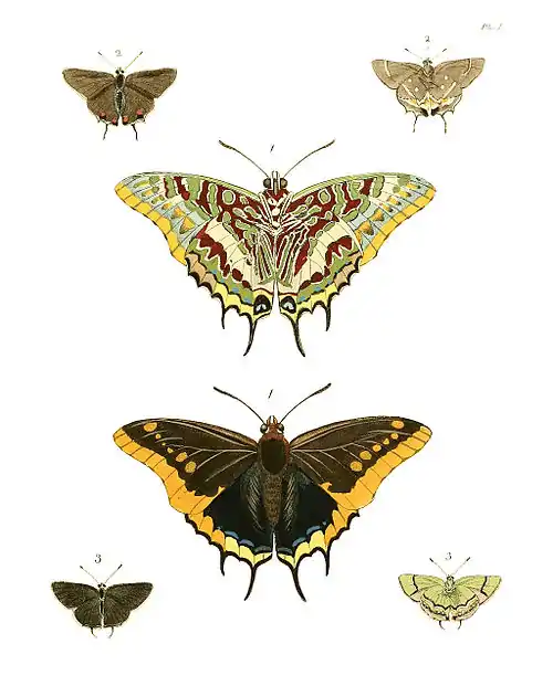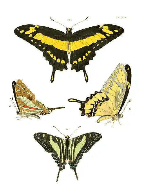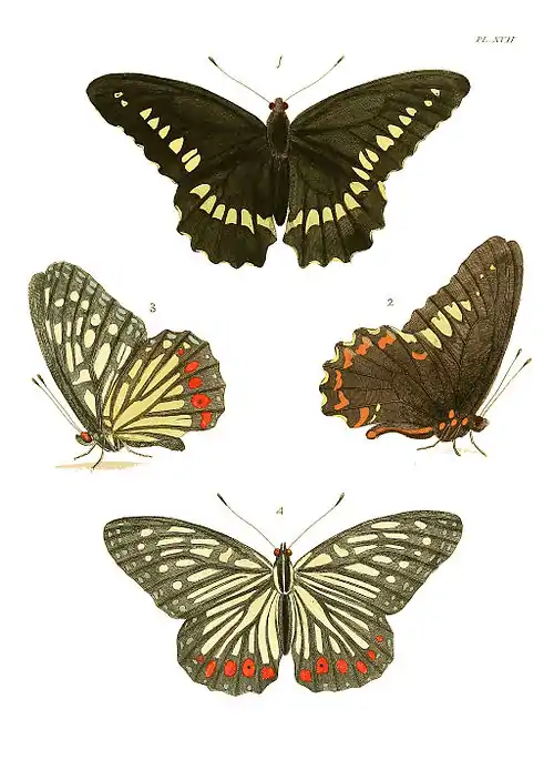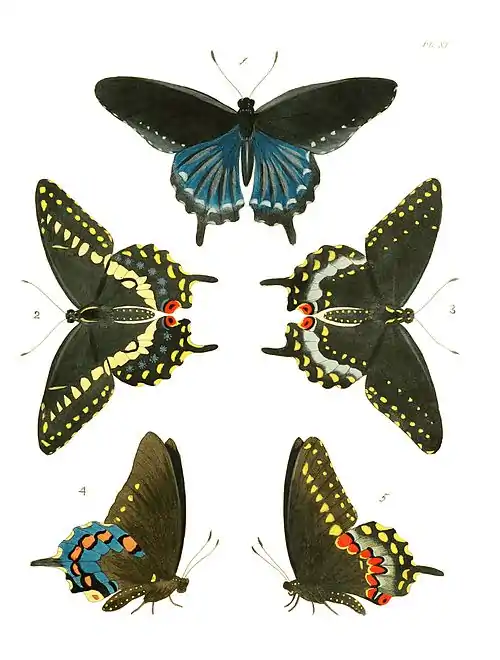 - ↑ Sir J. E. Smith states that the Linnæan cabinet does not contain a specimen of this insect, nor of the Ilioneus of "the Insects of Georgia," pl. 2, one of the figures of which was considered by Mr. Jones, the celebrated lepidopterist, to be the Linnæan Troilus. Nevertheless, on the authority of the Banksian cabinet labelled (from recollection alone) by Fabricius, Sir J. E. Smith gave the Asterias under the name of Troilus, and the true Troilus as a new species.