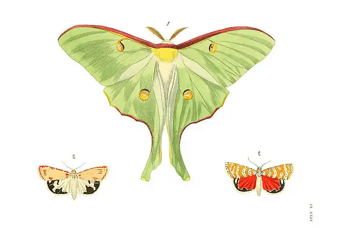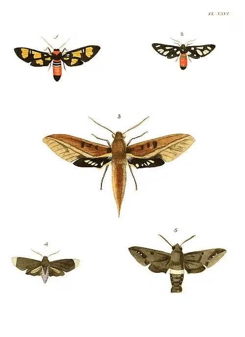 - ↑ The original title of this work, Vol. I., was "Illustrations of Natural History, wherein are exhibited upwards of two hundred and forty figures of Exotic Insects, according to their different genera, very few of which have hitherto been figured by any author, being engraved and coloured from nature, with the greatest accuracy, and under the author's own inspection; on fifty copper-plates; with a particular description of each Insect, interspersed with remarks and reflections on the nature and properties of many of them, by D. Drury, 1770." The second volume containing upwards of two hundred and twenty figures, on fifty copper-plates, appeared in 1773; and the third containing upwards of two hundred figures, also on fifty plates, was not published until 1782. The majority of the plates were drawn and engraved by the celebrated Moses Harris, but some of the plates in the last volume were by a different hand.