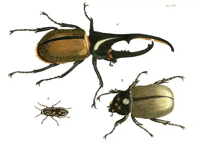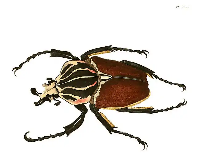 - ↑ Since this was written, I have been favoured by Mr. Mac Leay with an inspection of his magnificent collection, which possesses a Goliathus, nearly resembling the insect here figured, and which that gentleman considers as a variety of this. It is, however, considerably smaller, and the horns of the head are not so much developed.