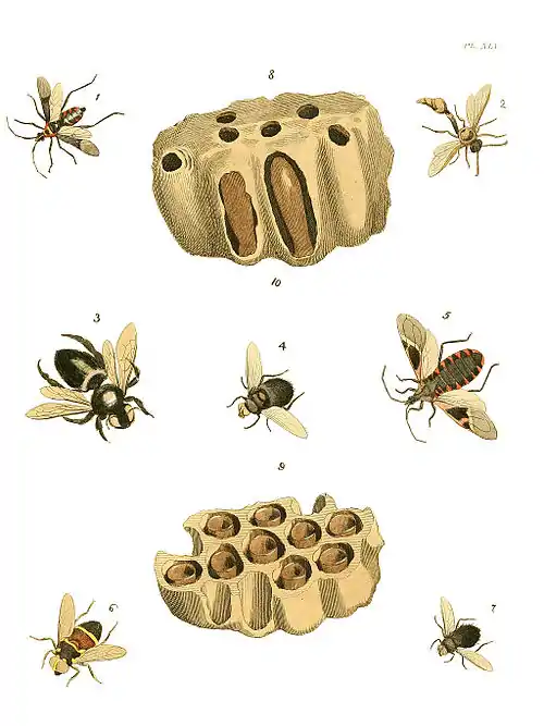 - ↑ From our information respecting the habits of the indigenous and European species of Fossorial Hymenopterous insects, including the Pelopæus spirifex, it is evident that the male takes no share in the labour of constructing the nest. See my memoirs upon this subject in the "Annales de la Société Entomologique de France," for 1836, and the Transactions of the Entomological Society of London, vol. i. for the same year, and the Memoirs of Saint Fargeau and Shuckard therein referred to.