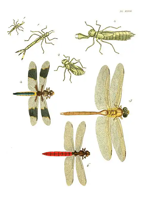 - ↑ "The morning is the time they generally choose for completing this change, because I am pretty certain it is in their power to retard this regeneration considerably, if I can judge from concurrent circumstances attending those I have kept in glass bowls, on purpose to observe their nature and behaviour. In one of these I have seen two libella-caterpillars, that were fully grown, for three days successively creep up the straws out of the water, in order to undergo their transformation; but finding themselves deprived of the sun-shine, (a circumstance generally attending this performance,) or at least that agreeable warmth of air so necessary for their purpose, they retired into the water: in an hour's time they made another essay, but finding the same circumstances subsisting as before, they again retired under water, and this they continued doing for three mornings; till at length one of them, wearied out by those frequent efforts, the period of nature not being to be totally avoided or suppressed, although it might be retarded, perished in the water, being at length so weak as to be unable to creep above its surface. The other, on removing the vessel into the sunshine, yielded its proper insect."
