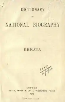 The Dictionary of National Biography (DNB) is a standard work of reference on notable figures from British history. It was originally published in 63 volumes between 1885 and 1900. The 1901 supplement extends coverage to the end of Queen Victoria's reign. The errata were published in 1904 to amend biographies based upon added research.
