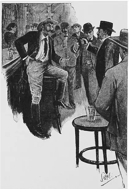 As it chanced, just as the inspector was emphasising the above statement, garnished with certain verbal frillings which need not be produced here, by slapping his four fingers on the bar counter, Mr. Seth himself lounged into the room. The instant turning of the eyes of the company on to him told him, as plainly as any words could have done, that he was the subject of the inspector's eloquence. The crowd saw at a glance that he had taken in the situation, and everyone expected a royal row, for Salter was known to have a temper as quick as his eye and his hand, and Lipinzki, though only about half the Yankee's size, was grit all through.