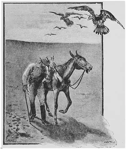 Forty days later, half-a-dozen heavywinged aas-vogels were wheeling slowly to and fro in the dead, breathless air, looking down in hideous anticipation at two slowly moving figures which were dragging themselves, seemingly with the last efforts of their lives, over the frightful wilderness of sand and stone and dwarfed thorny shrubs, which stretched away in a ghastly monotony of unbroken level till the wearied eye could see no further. One was the figure of a man, the other that of a mule. Two biggish bundles were slung across the mule's saddle. They were neither very big nor very heavy, yet every now and then the mule stumbled feebly under them. The man had tied his left hand to the saddle, and in his right he had a whip-stock, which he was using half as a walking-stick and half as a crutch.