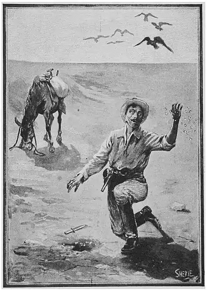 The mule tottered to one of the sand patches and thrust her nose into the sand with a hoarse, rattling grunt. At the same moment it flashed across Tom's half-clouded mind that water is often found beneath the dry beds of vanished African streams. He cut his hand loose, flung himself down on the sand, and began to dig with his knife feebly but desperately. The mule, meanwhile, began scraping with her fore-hoofs, and this encouraged him to go on. He broke the sand up with the knife-blade, and scooped it out with his hands. Presently the knife-blade began to rattle and clink against pebbles in the sand, and when the hole was about a foot deep there were more stones than sand.