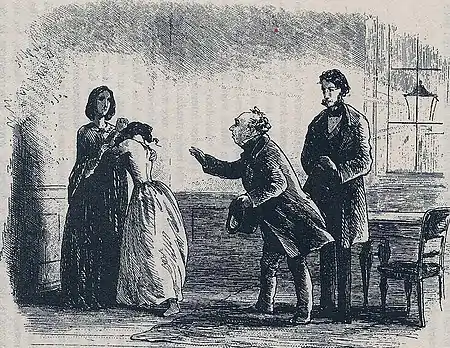‘Politeness must yield to this misguided girl, ma’am,’ said Mr Meagles, ‘at her present pass; though I hope not altogether to dismiss it, even with the injury you do her so strongly before me. Excuse me for reminding you in her hearing—I must say it—that you were a mystery to all of us, and had nothing in common with any of us when she unfortunately fell in your way. I don’t know what you are, but you don’t hide, can’t hide, what a dark spirit you have within you. If it should happen that you are a woman, who, from whatever cause, has a perverted delight in making a sister-woman as wretched as she is (I am old enough to have heard of such), I warn her against you, and I warn you against yourself.’