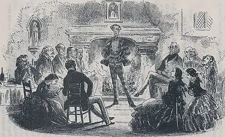 The young gentleman who was standing in an easy attitude on the hearth, cocking his glass at the company, with his back to the blaze and his coat tucked under his arms, something as if he were Of the Poultry species and were trussed for roasting, lost countenance at this reply; he seemed about to demand further explanation, when it was discovered—through all eyes turning on the speaker—that the lady with him, who was young and beautiful, had not heard what had passed through having fainted with her head upon his shoulder.
