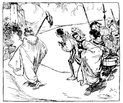 And she picked up the army of the enemy in handfuls and double-handfuls, and put them back into their ships, and gave a little flip to each transport ship with her finger and thumb, which sent the ships off so fast that they never stopped till they reached their own country, and when they arrived there the whole army to a man said it would rather be courtmartialled a hundred times over than go near the place again.
