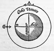 ays of magnetick virtue spread out in every direction in an orbe; the centre of this orbe is not at the pole (as Baptista Porta reckons, Chap. 22), but in the centre of the stone and of the terrella. So also the centre of the earth is the centre of the magnetick motions of the earth; though magneticks are not borne directly toward the centre by magnetical motion, except when they are attracted by the true pole. For since the formal power of the stone and of the earth does not promote anything but the unity and conformity of disjoined bodies, it comes about that everywhere at an equal distance from the centre or from the circumference, just as it seems to attract perpendicularly at one place, so at another it is able even to dispose and to turn, provided the stone is not uneven in virtue. For if at the distance C from the pole D the stone is able to allure a versorium, * at an equally long interval above the æquator at A that stone can also direct and turn the versorium. So the very centre and middle of the terrella is the centre of its virtue, and from this to the circumference of the orbe (at equal intervals on every side) its magnetick virtues are emitted.