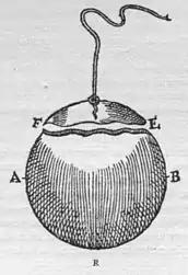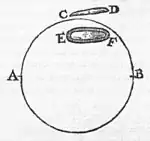 following demonstration, and comes about of necessity according to all magnetick laws. Let there be a terrella with poles A B; from its mass cut out a small part E F; if this be suspended by a fine thread above the hole or over some other place, E does not seek the pole A but the pole B, and F turns to A; very differently from a rod of iron C D; because C, touching some northern part of the terrella, being magnetically carried away makes a turn round to A, not to B. And yet here it should be observed, that if the pole A of * the terrella were moved toward the earth's south, the end E of the piece cut out by itself, if not brought too near to the stone, would also move of itself toward the south. But the end C of the piece of iron, placed beyond its orbe of virtue, will turn toward the north. The part E F of the terrella, whilst in the mass, produced the same direction as the whole; but when it is separated and suspended by a thread, E turns to B, and F to A.