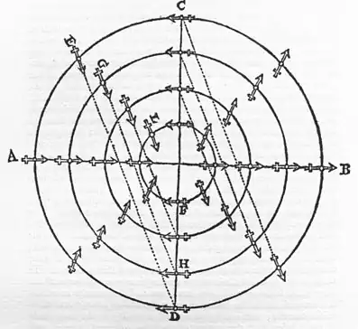 A B is the axis of the terrella and of the orbes, C D the æquator. On all the orbes, as on the terrella, at the equator the versorium arranges itself along the plane of the horizon; on the axis it everywhere looks perpendicularly toward the centre; in the intermediate spaces E looks toward D; and G looks toward H, not toward F, as the versorium L does on the surface of the terrella. But as is the relation of L to F on the surface of the terella, so is that of G to H on its orbe and of E to D on its orbe; also all the rotations on the orbes toward the termini of the orbes are such as they are on the surface of the terrella, or toward the termini of its surface. But if in the more remote orbes this fails somewhat at times, it happens on account of the sluggishness of the stone, or on account of the feebler forces due to the too great distance of the orbes from the terrella.