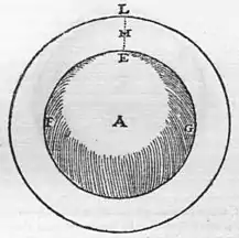 Let E F G be the Earth's globe, A its centre, L E the ascending effluvia: Just as the orbe of the effluvia progresses with the Earth, so also does the unmoved part of the circle at the straight line L E progress along with the general revolution. At L and E, a heavy body, M, falls perpendicularly toward E, taking the shortest way to the centre, nor is that right movement of weight, or of aggregation compounded with a circular movement, but is a simple right motion, never leaving the line L E. But when thrown with an equal force from E toward F, and from E toward G, it completes an equal distance on either side, even though the daily rotation of the Earth is in process: just as twenty paces of a man mark an equal space whether toward East or West: so the Earth's diurnal motion is by no means refuted by the illustrious Tycho Brahe, through arguments such as these.