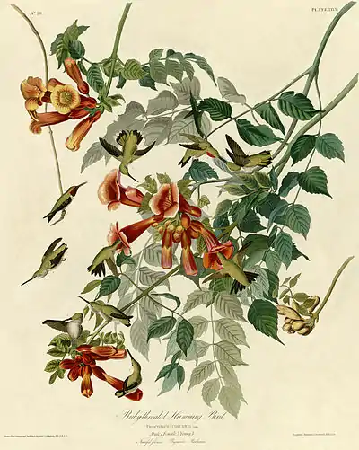 I have represented ten of these pretty and most interesting birds, in various positions, flitting, feeding, caressing each other, or sitting on the slender stalks of the trumpet-flower and pluming themselves. The diversity of action and attitude thus exhibited, may, I trust, prove sufficient to present a faithful idea of their appearance and manners. A figure of the nest you will find elsewhere. The nest is generally placed low, on the horizontal branch of any kind of tree, seldom more than twenty feet from the ground. They are far from being particular in this matter, as I have often found a nest attached by one side only to a twig of a rose-bush, currant, or the strong stalk of a rank weed, sometimes in the middle of the forest, at other times on the branch of an oak, immediately over the road, and again in the garden close to the walk.