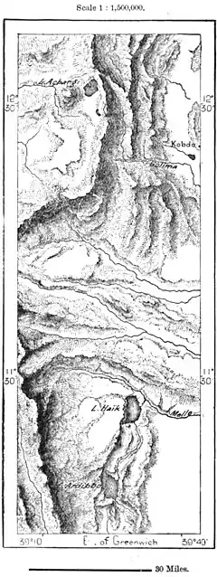 of quartz being often of a pink hue, caused by the oxide of iron. According to; Heuglin, at least one of the craters, from which were formerly ejected the Hamasen lavas, has been perfectly preserved. Rising midway between Keren and Adua to a height of about 400 feet, it is stated to Fig. 45. — Lakes of East Abyssinia.