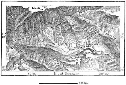 and children; cisterns and wells sunk in the soil supply it with water, whilst the fertile neighbouring valleys furnish provisions in abundance. It was at Magdala that Theodore kept for two years the English prisoners, for whose rescue an Anglo-Indian Army was dispatched in 1868. The fortress of Magdula, destroyed by the English, and afterwards conquered by the King of Shoa from an independent chief, and ceded by him to his sovereign, the King of Abyssinia, has since been restored, on account of its great strategic importance. It forms an advanced outpost in the Galla country, which is traversed by the shortest route to the kingdom of Shoa. At the eastern base of the rocks of Magdala, in a gorge commanded eastwards by