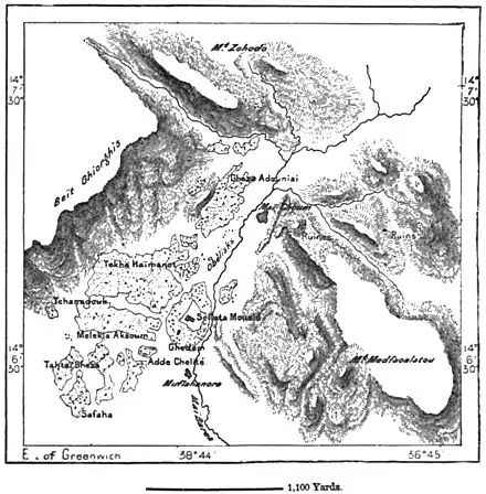 the law," and of the holy ark of the Jews brought back from Jerusalem by Menelik, son of Solomon and the Queen of Sheba. But Aksum possesses some genuine antiquities, which the inhabitants watch over with jealous care. A column bears a Greek inscription, now almost illegible, which commemorates the victims of a certain King Aeïzanas, "son of the invincible Arès." Is this Aeïzanas identical with La San, the Christian king who lived in the middle of the fourth century of the vulgar era, or did he belong to the earlier pagan dynasty, as might be supposed from his claim to the title of the son of Mars? Howsoever this