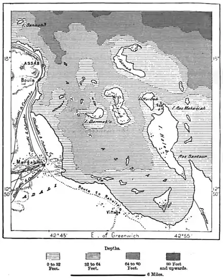 36 miles from Bab-el-Mandeb, north of a long littoral indentation. Numerous islets scattered at the entrance of the harbour shut out the sea, excepting to the north-east, and are continued by reefs which the sand, mud, seaweed and coral are gradually causing to encroach on the bay, so that these islands must sooner or later become a peninsula of the mainland. The well-protected port, situated on