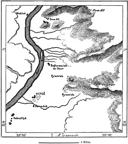 The remains of the town in which Cailliaud recognised in 1821 the ancient Meroë, "capital of Ethiopia," stand 30 miles below Shendi, a few miles from the right bank of the Nile; in the midst of these ruins are scattered a few villages, amongst others that of Es-Súr, which gives its name to the tarabil, or pyramids. The pylons, temples, colonnades, avenues of animals and statues are still standing; but the sandstone of Meroë, excavated from the neighbouring quarries, is not so durable as that of Egypt. The pyramids, to the number of about eighty, are