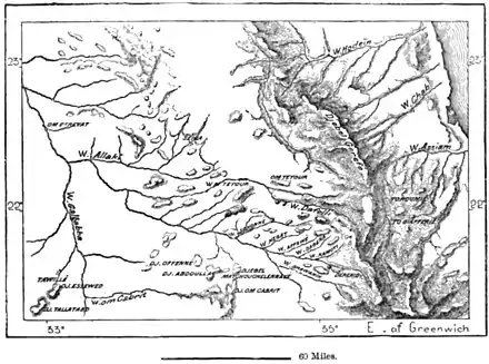 parallel with the shores of the Arabian Sea. Besides, known under different names at each of their several sections, they extend for a distance of over 600 miles to the very gates of Cairo. It is the Egyptian part of this long ridge which takes the name of the "Arabian" range, because the riverain Nile populations see it standing out against the sky in the direction of Arabia. The Nubian Mountains, east of the Nile, are also sometimes collectively termed Etbaï, a name which is more especially reserved for a hill which rises near the coast opposite Jedda.