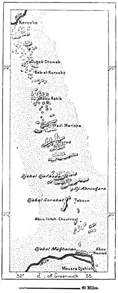 scattered by thousands in the desert. They are small sandstone hills merely rising some 60 feet above the plain, but at some points attaining a relative elevation of 660 feet, or from 1,630 to 2,000 feet above the sea. The granite heights in the interior reach an altitude of over 2,160 feet, some of the peaks even rising to nearly 3,300 feet.