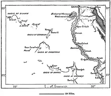 The Siwah oasis, where spoke the renowned oracle of Ammon, consulted on one occasion by the Macedonian conqueror, rivals in beauty that of Dakhel, although the limestone hills forming its outer enclosure cannot be compared with the picturesque heights of the Bab-el-Cailliaud. Nevertheless they present scarcely less fantastic forms. In certain parts of the plateau the cliffs terminate in flights of steps with perfectly horizontal slabs and of uniform depth, like those leading to some palatial structure. The strange effect is heightened by the colour of the stone, which contrasts vividly with the white sand strewn over the steps. In the
