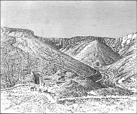 West of the chief eminence, and not far from the Sheikh Abd-el-Kurnah, another hill pierced with galleries like a rabbit-burrow, a series of terraces is