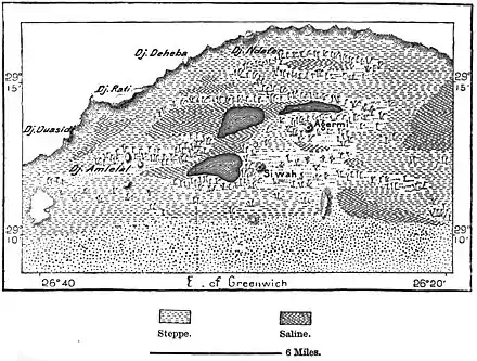 The oases farther removed from the Nile and forming a physical dependence of Cyrenaica rather than of the fluvial region, constitute the Siwah group, famous in ancient times for the oracle of Ammon, which, according to Herodotus, was of equal antiquity with that of Dodona. Siwah and Agermi, the two chief towns in the oasis, are built of nummulitic limestone and blocks of impure rock salt, each on the slope of a rocky hill. Their outer walls and terraces are so disposed as to form irregular fortresses of extremely picturesque appearance. That of Siwah, approached by no less than fifteen gates, has a circumference of not more than 1,260 feet, and its ramparts are surmounted by high, square, and round towers, all