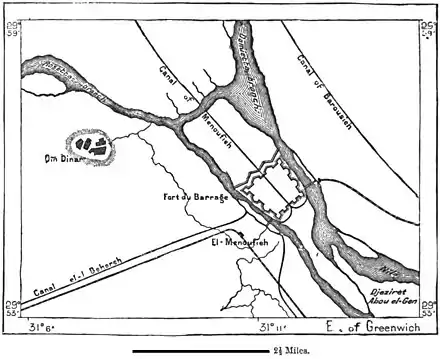 Menufieh Canal intersects the large island of Shalaganeh, which has been converted by walls and ramparts into a fortified stronghold. This is the important fortress of Saadieh, which at once commands both branches of the Nile, and the two principal lines of railway in Lower Egypt. This colossal work, the first stone of which was laid by Mohammed Ali in the year 1847, was originally planned for the purpose of reclaiming many tens of thousands of acres of waste land and regulating the navigation throughout the whole of Lower Egypt. But the enthusiasm of the Albanian viceroy was not sustained by an equal degree of perseverance, and some parts of the general design were either neglected or indifferently executed. Hence the foundations have partly given way, wide openings are visible in many of the