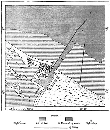 long, and they jointly enclose a space of about one square mile in extent, which gives ample room for the largest vessels to ride at anchor, and which in front of the city ramifies into several basins, affording a further space of 175 acres for the shipping. Facing the city on the east or Asiatic side are vast depots of coal, of which over 540,000 tons were imported in the year 1883. On the southern or African side are the workshops and dry docks built for the construction and repair