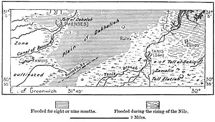 The enclosure surrounding the great temple is no less than 80 feet thick,[1] and the modern observer may well ask how such a metropolis could have been raised in the midst of these half-submerged lands, these swamps, and quagmires, and saline depressions now skirting Lake Menzaleh. But the district seems to have undoubtedly undergone vast changes since the oldest recorded times, changes which should probably be attributed to local subsidence.