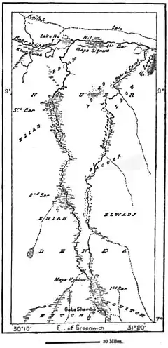 have been frequently arrested by this obstacle. During the latter half of the present century most of them have had to force their way through the tangled masses, and one of the channels thus formed by Miss Tinne’s steamer still bears the name of Maya Signora. During the seven years from 1870 to 1877 the river was completely blocked, obliging all travellers to continue their journey by the Bahr-ez-Zaraf. Many were detained for weeks and months on these pestiferous waters, over which hover dense clouds of mosquitoes. Here Gessi was arrested in 1880 with five hundred soldiers and a large number of liberated slaves, and three months elapsed before an Egyptian flotilla, under Marno, was able to rescue them by opening a passage from below. Devoured by the insects, wasted by fever, and reduced to live on wild herbs and the dead bodies of their unfortunate comrades, most of the captives found a grave in the surrounding swamps, and nearly all the survivors perished of exhaustion soon after. Gessi himself outlived the disaster only a few months. To the lagoon of No must be attributed those “ green waters” noticed at Cairo during the early days of June, when the stream, charged with vegetable