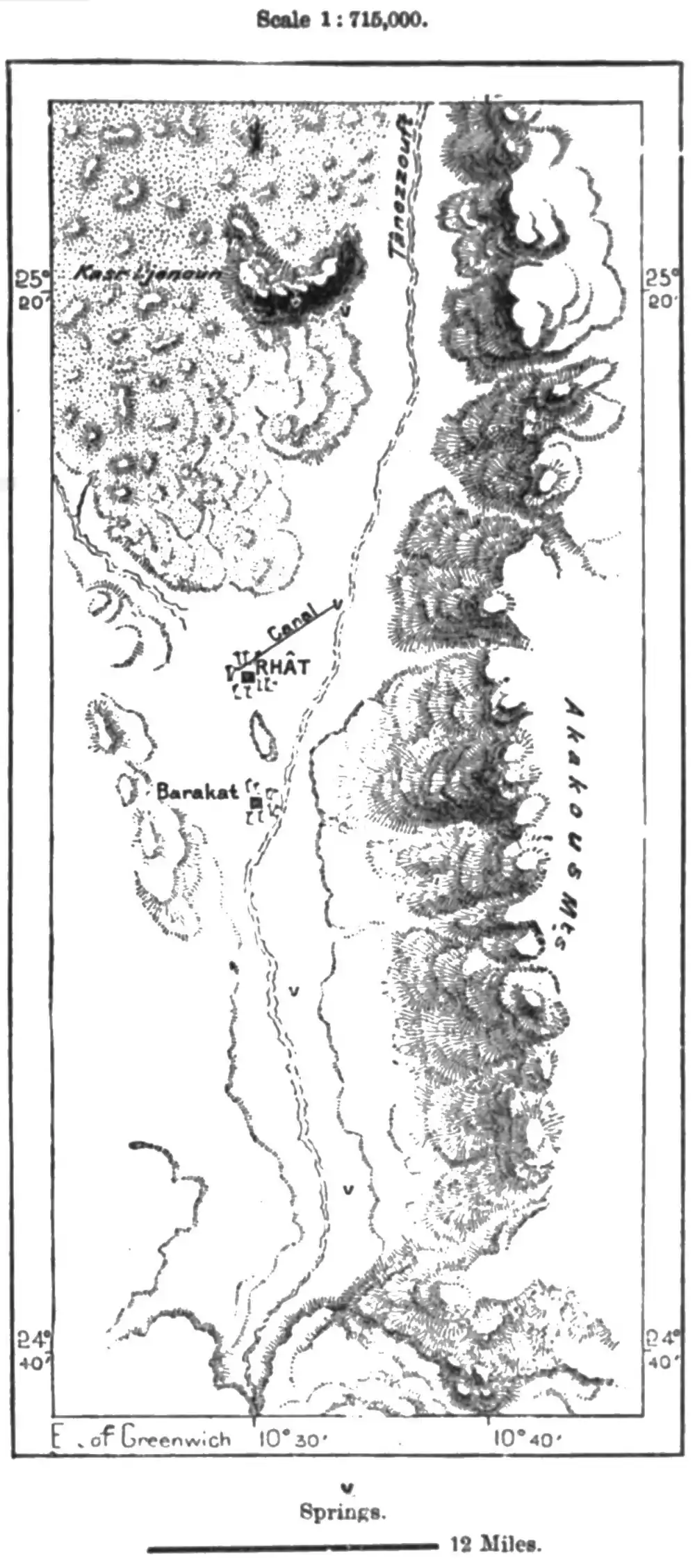 Rhất stands on a slight eminence at the north-west foot of a rocky hill. Within the ramparts it is almost geometrically divided into six quarters by streets terminating at as many gates. The houses are in the same style, but generally smaller and less numerous, than those of Ghadames. Within the enclosures the population scarcely exceeds four thousand; but outside are a number of villages, and in the intervening space is held the annual fair, on which the prosperity of the plain largely depends. The surrounding plain is here and there dotted over with clumps of palms and other trees; but the oasis nowhere presents the continuous stretches of verdure seen at Ghadames. Yet it would be easy to extend the area of culti-