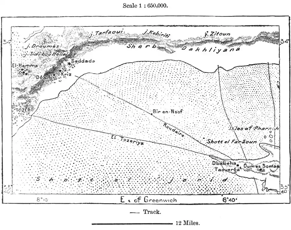 At its western extremity this huge lacustrine plain is culled by various other names. It is no less than 120 miles long from east to west, with a breadth, from north to south, at the widest part, of 45 miles. The riverain people say that water remains permanently only in the central part of the Shott-el-Jerid; but this water is not visible, being hidden by a saline crust, which suggested to the Arab authors its comparisons to a silver leaf, a crystal sheet, a bed of camphor. On it the footsteps re-echo as on the stones of an archway.