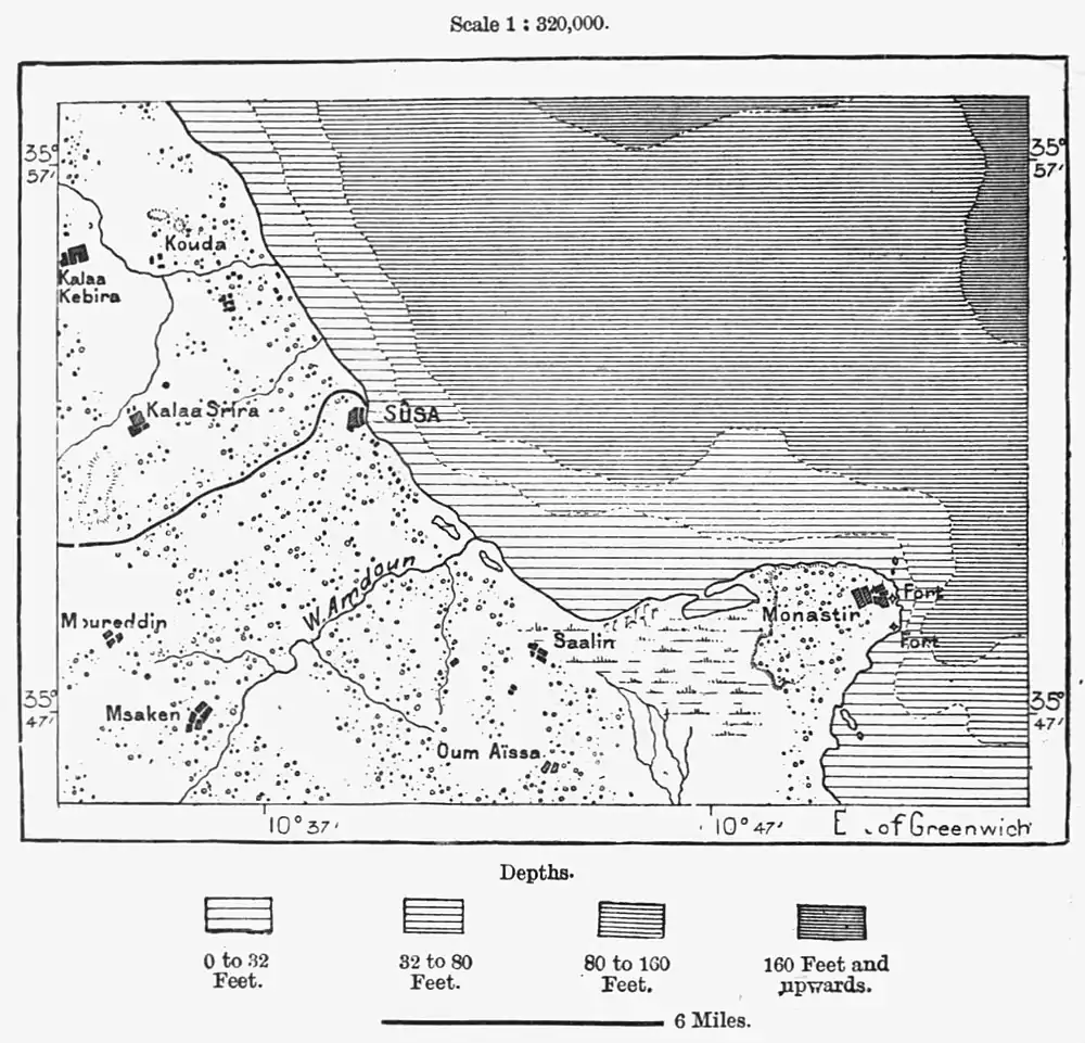 probably of Phœnician origin. They recently served as places of shelter to the tunny-fishers, and have occasionally been used as places for keeping sailors and travellers in quarantine. Farther east, the group of Kuriateïn Islands which is connected with Cape Dimas by a submarine bank, is, according to Tissot the remnant of a considerable tract of land, which was still in existence at the Punic period; however, the documents on which this hypothesis is founded are not definit enough to lend much value to the statement.