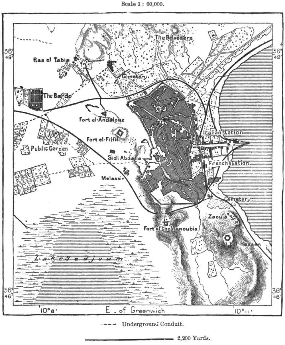 itself probably the work of man. In the middle of the Bahira a navigable way is to be formed by dredging to a depth of about 20 feet, which would suffice for the vessels now frequenting the port of Goletta. The future basin would have an area of about 25 acres. Fishing is very productive in the Bahira of Tunis, the thirty boats employed in this industry yielding a yearly supply valued at fifteen hundred tons. Some speculators have proposed to drain the Bahira; but in any case it will be necessary to empty the Sebkha of Seljum, which during the floods covers a space