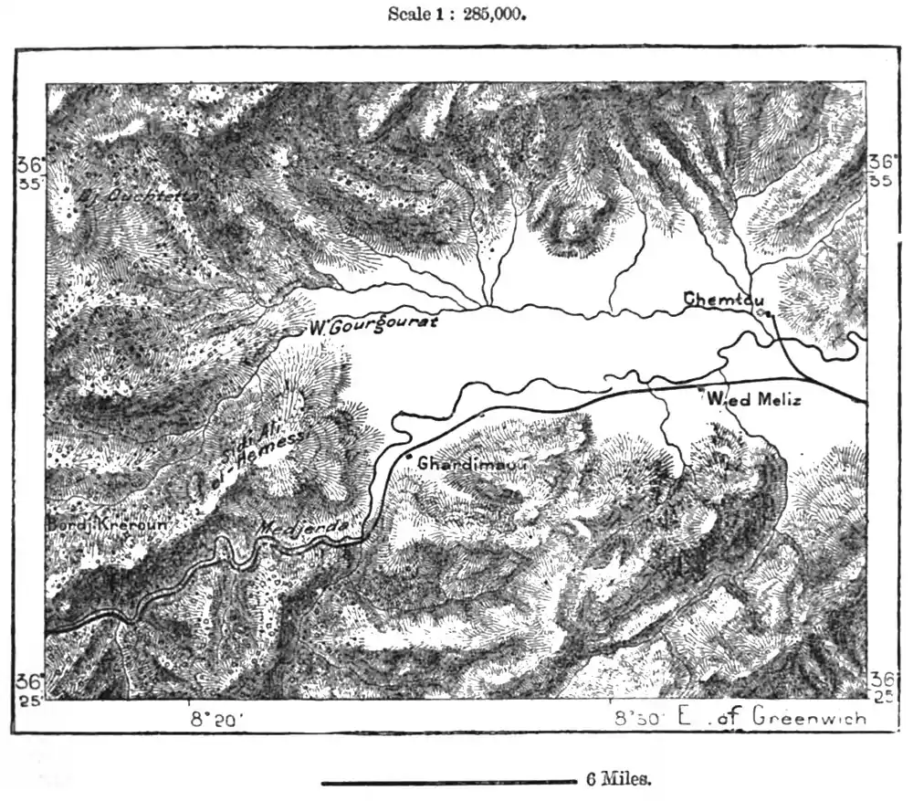 In the Mejerda valley, the rising village of Ghardimau, the present frontier military station and custom-house, stands at the mouth of the gorges through