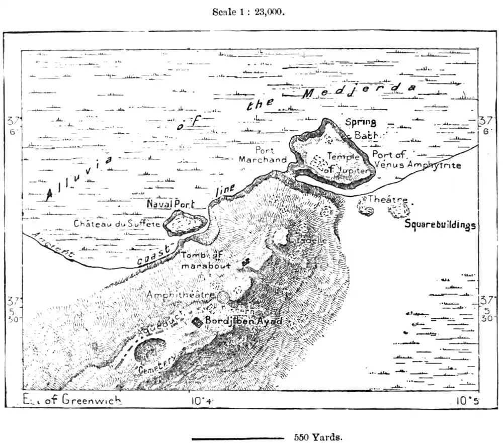 North of Jedeïda, the Mejerda, which winds through the lowlands and marshes, has no more towns upon its banks. The city of Utica, the elder sister of Carthage, which commands its mouth, is now indicated merely by a kubba, the "marabut" of Bu-Shater, a name meaning the "Father of Skill" or the "Wise Man,"