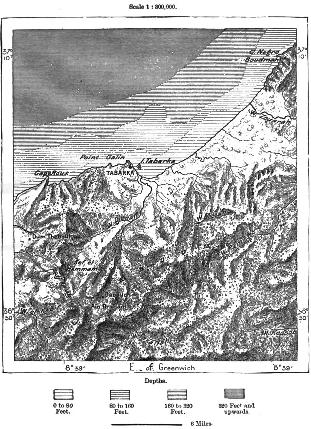 necessary accommodation, and when the routes running inland are bordered by towns and villages. During the invasion of Khumiria, the operations of the French fleet commenced in the roadstead of Tabarka, where the plan of a new town has been traced out near the shore, at the south-east base of the steep Borj Jedid hills, and south of the islet where still stands the castle occupied by the Genoese Lomellini