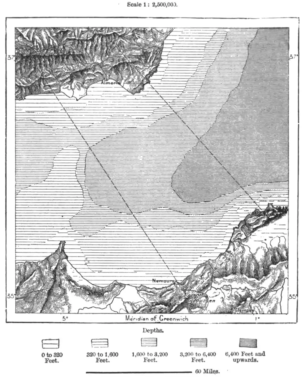 frontier, a view is commanded in clear weather of the crests of the sierras on the opposite coast of Spain, at a distance of no less than 168 miles. It thus became possible to connect the network of Algerian triangulation with that of the Iberian peninsula without passing through Marocco. The four points chosen for the connecting quadrilateral were Mulhacen in the Sierra Nevada, Tetica in the Sierra de los Filabres, at the south-cast angle of the peninsula, Filhausen in the Trara